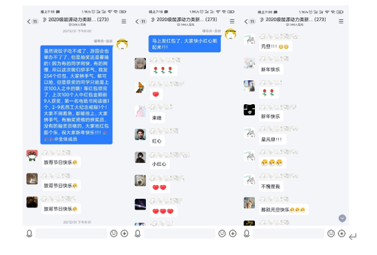 当晚20:30,为了使身处异地他乡的同学们能够度过一个温暖、快乐、难忘的跨年夜,2020级能源动力类本科生在辅导员的带领下利用QQ群进行了新年问候与新年抽奖活动,同学们在QQ群里纷纷发言表达自己对同学们的祝福。虽未欢聚一堂,但却其乐融融,通过元旦慰问和线上活动,不仅让同学们在学校感受到了家一般的温暖,也让同学们对学校“以学生为根”的办学理念有了更深入的体会,增强了同学们对学校和学院的认同感,提升了同学们“航发报国”的责任感和使命感。