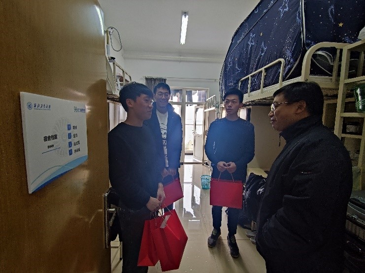 慰问过程中,王占学代表学院向同学们致以新年的问候,并亲切的与同学们拉家常,从“家乡在哪”、“家里几口人”,到“学习生活有没有困难”、“大学学习有什么计划”、“未来想从事什么职业”,王院长一边听取同学们的介绍,一边结合自己的工作、学习经历,给同学们提出建议。他鼓励同学们要珍惜大学的美好时光,利用好学校学院提供的各项资源和条件,抓住机会迎接挑战,除了保质保量完成自己的学习任务外,还要坚持锻炼身体,为自己未来的学习和生活打造强健的体魄。此外王院长还针对即将到来的期末考试,鼓励同学们抓紧本学期的最后15天,总结一学期的收获,按计划开展复习备考工作,争取在春节来临之际给家人拿出一份满意的成绩单。