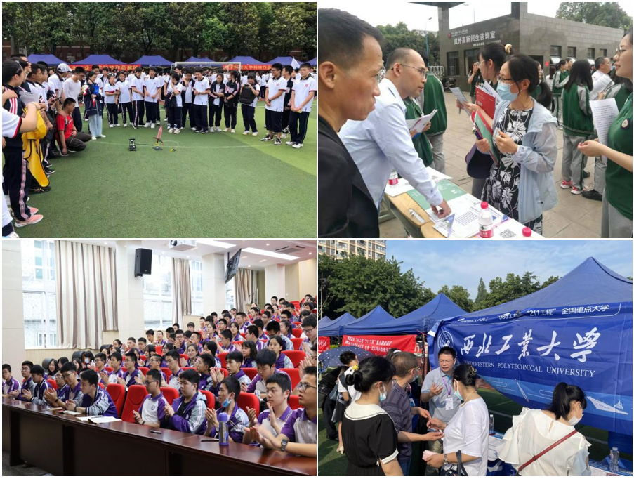 受疫情影响,招生组积极与多所中学的沟通意见,采取线下线上相结合的形式开展宣传,增强了招生宣传工作深度。根据往年招生数据,对于优质生源基地有针对性地进行宣传工作,利用航模表演队和科技创新展品等,深入参与中学科技节等节庆活动,增加宣传趣味性,并为后续与中学共同开展科技创新活动奠定基础。充分利用“两机专项”历史性快速发展的热度,结合学院自身专业特点,通过科普讲座、政策宣讲、招生咨询、科技交流等多种特色活动吸引学生。同时积极联络四川籍教师,扩大学生招生宣传队伍,积极利用校友资源联络中学,打通沟通桥梁。此外,四川招生组制定了完备合理的招生宣传计划,每周派出一名教师及一名学生到两所以上的中学进行宣传,将宣传范围扩大到全省各个地区,宣传场次比去年提高约30%,保证了常态化招生宣传工作的覆盖广度。