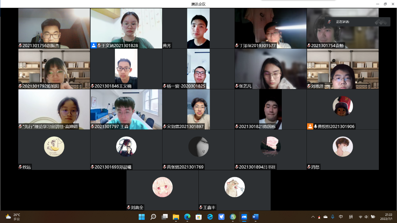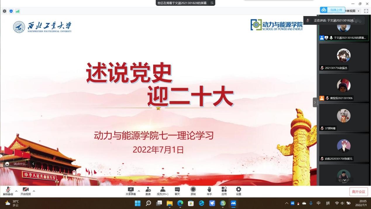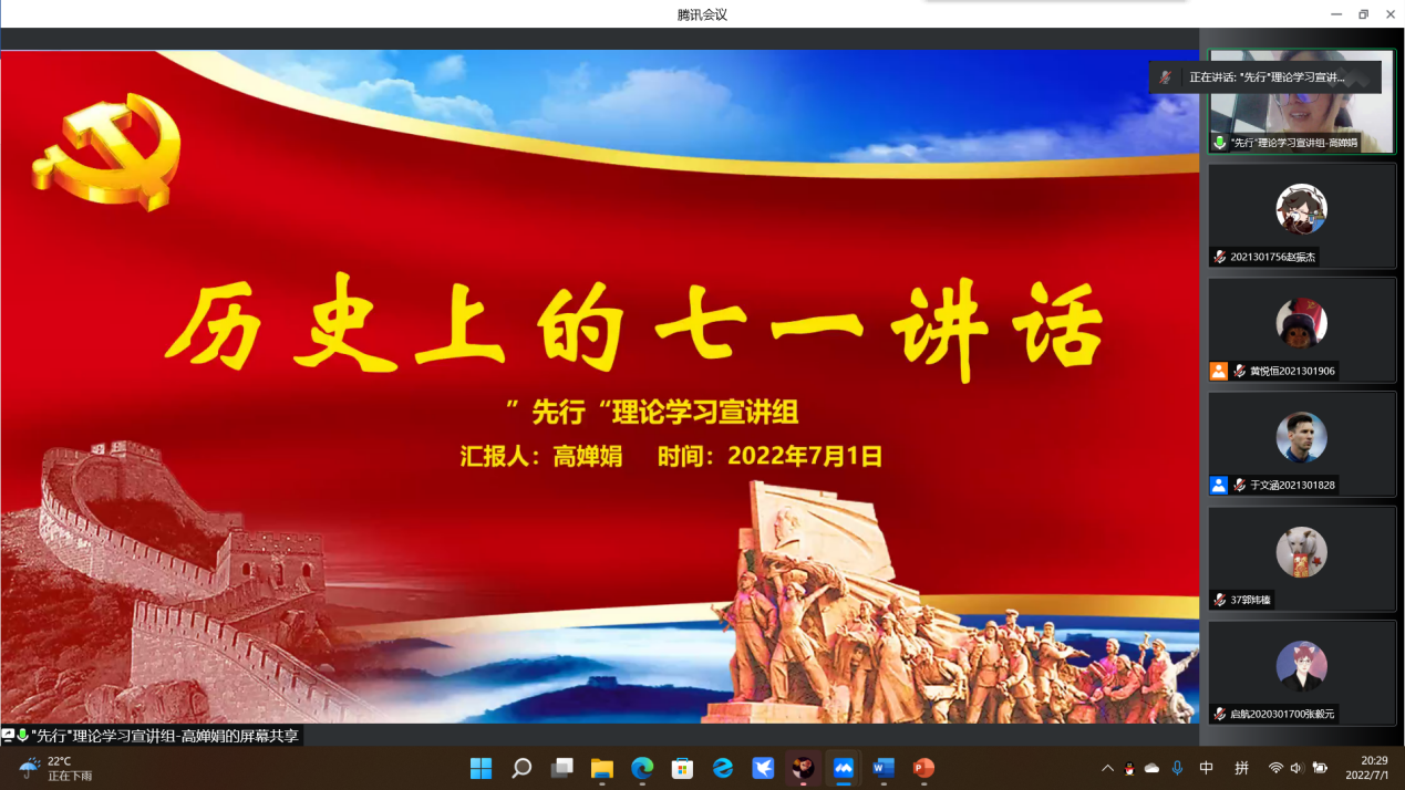 为迎接和学习宣传贯彻党的二十大, 推进无码动漫 学生理论学习,无码动漫 院会特于七一建党节之际邀请“先行”理论学习宣讲组于2022年7月1日晚作主题为“述说党史,迎二十大”的理论宣讲,鼓励全院学生坚定历史自信、筑牢历史记忆,满怀信心地向前进。参会人员有:学院党委副书记刘海涌,学院兼职辅导员武雯梅,理论宣讲组全体成员,学院学生会全体成员以及各班团支书及入党积极分子