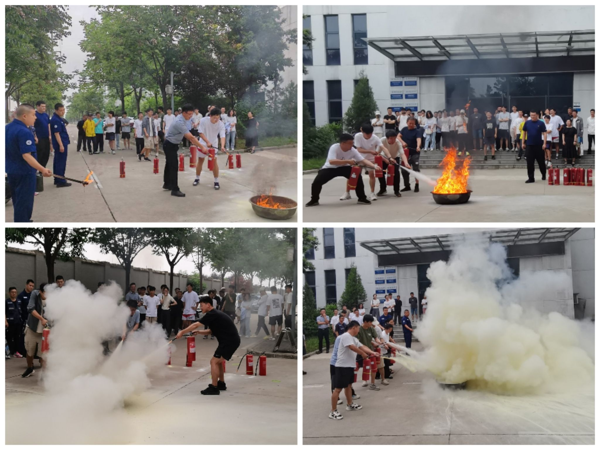 在飞行器动力实验中心西门外,消防科老师讲述灭火器使用方法和灭火注意事项并为师生做灭火示范。师生积极参与消防演练,亲身体验灭火,通过消防演练能使师生更熟练掌握消防器材的使用,增强应对突发火灾时的处理能力。