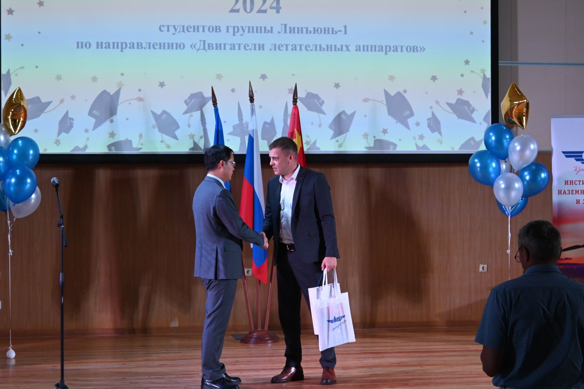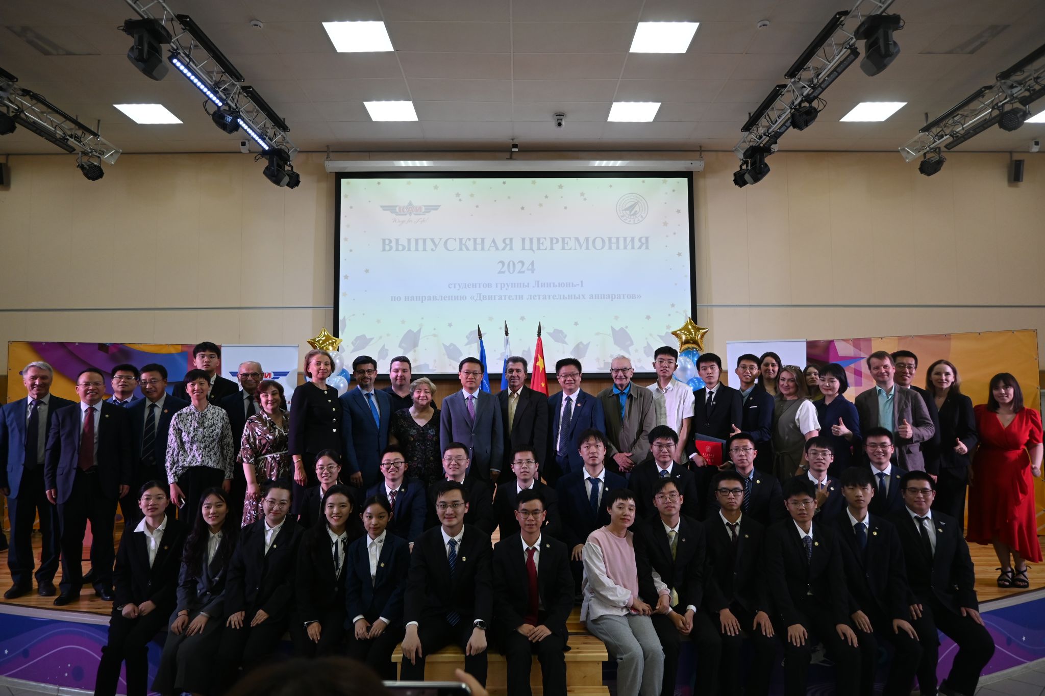 党委书记王占学在毕业典礼上赞扬同学们作为首届“凌云班”学子为后续西工大、喀航、萨马拉大学全方位合作做了很好的示范,祝愿大家带着自强向上的人生态度不断取得新辉煌,浩渺应无极,扬帆但信风。希望学子们能够牢记使命,为祖国的航发事业做出青春贡献,同时做好中俄友好的接力棒,让中俄科技交流、文化交流等结出更多硕果。王占学代表学院给每位毕业时赠送了包含某型航空发动机模型、“一宿舍两院士”签名和“为国铸剑”摆件的毕业大礼包。
