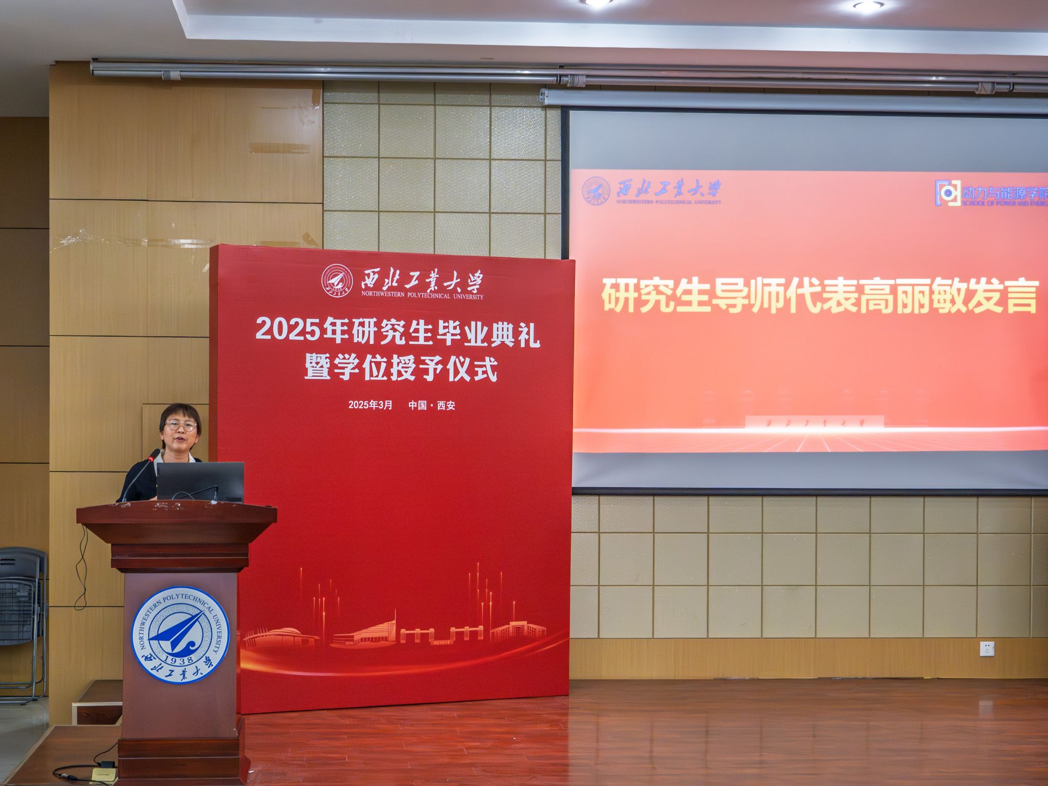 导师代表高丽敏教授发言。数千次实验测试、数千组仿真数据,同学们流过的汗,熬过的夜把工程难题转为论文创新,解决航空发动机的“卡脖子”难题。她提到让同学们永远做“有灵魂”的工程师,如压气机般厚积薄发,永葆燃烧室的炽热初心,铸就涡轮的坚韧品格。以工程为笔,以山河为卷,继续书写着西工大人特有的硬核浪漫。