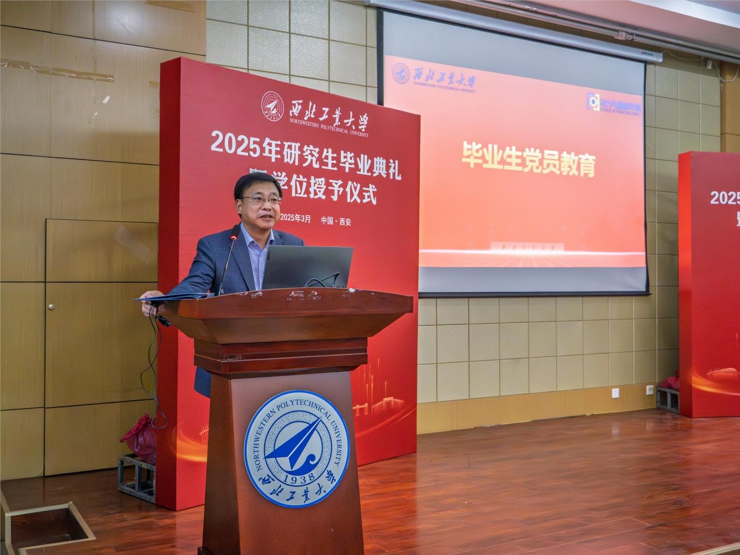 王占学为毕业生党员开展教育活动并颁发纪念品。他提出三点希望与即将走向社会的毕业生们共勉:一是多利他,少利己。多做利他的事,少做利己的事,要有博大的胸怀,切实为单位发展做出自己的贡献。二是多担当,少抱怨。脚踏实地,献身国防行业,发扬学校“三实一新”的校风,写好自己的西工大故事。三是多读书,少浮夸。在信息爆炸的时代,静下心来读书,丰富自己的精神世界。