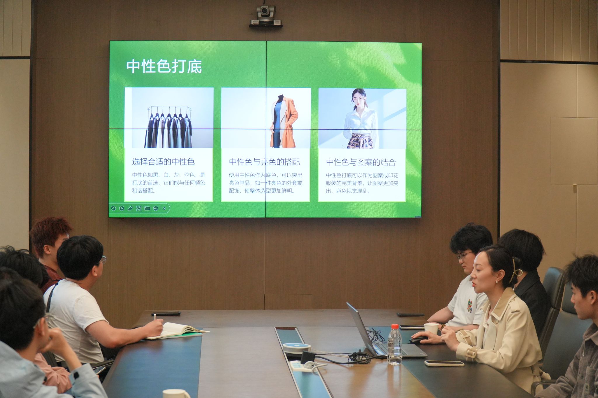 首先,严凰老师介绍了日常着穿搭的技巧,严老师详细讲解了基础款服装的选择与搭配逻辑,强调了中性色打底、同色系进阶、小面积亮色等颜色搭配法则,并提醒同学们避免“五彩斑斓”的搭配误区。她还根据不同体型提供了实用的穿搭建议,并分享了不同季节、不同场合的搭配技巧。
