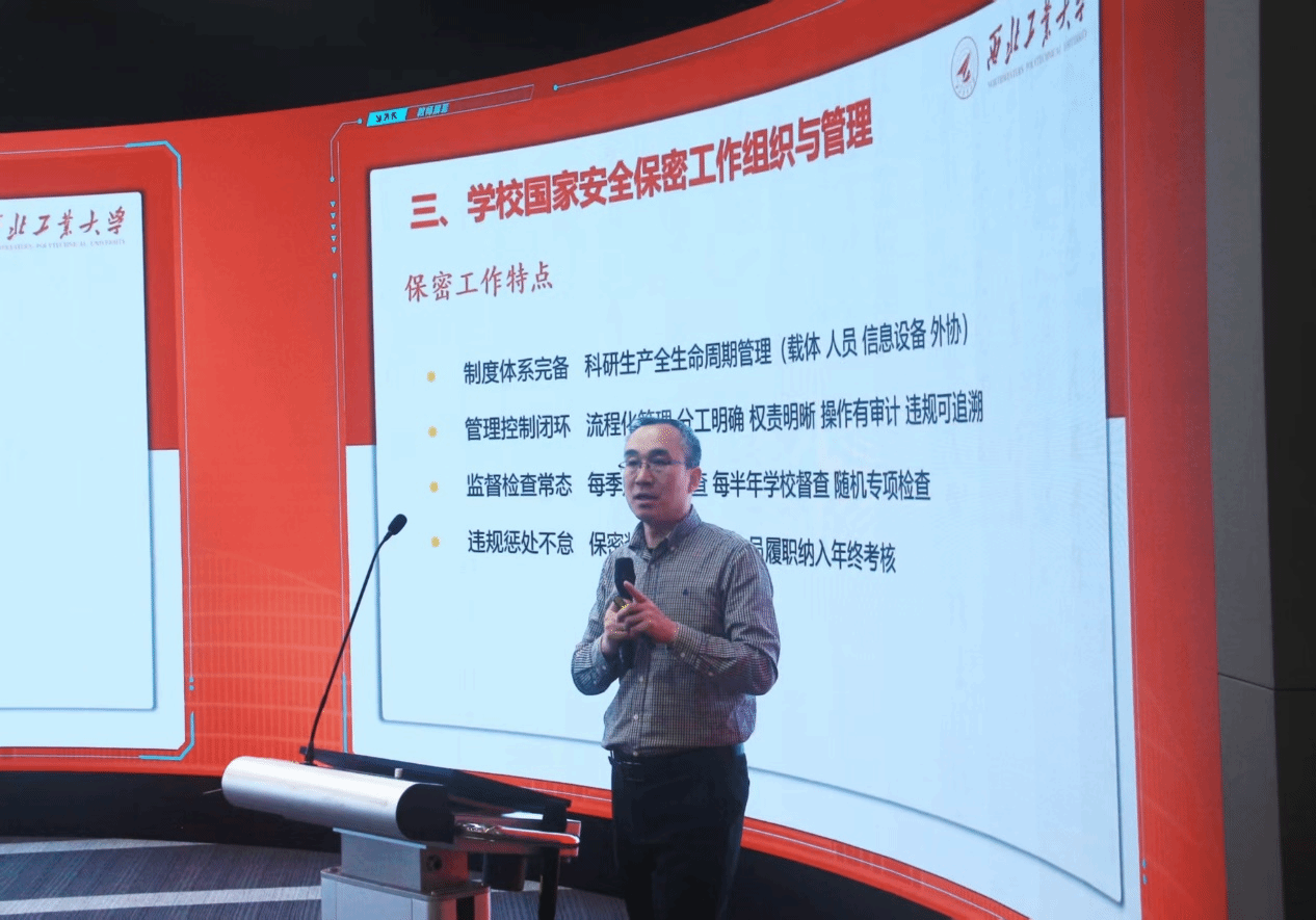 王革明老师围绕保密工作的核心意义、高校保密工作的重点领域和突出风险点展开,并结合高校科研、教学、日常办公中的典型泄密案例,深入剖析了涉密文件管理、网络信息传播、科研数据存储等环节的保密隐患,详细解读了国家保密法律法规和学校保密工作管理规定,同时针对师生日常工作学习中可能遇到的保密疑问,进行了具体指导,明确了保密工作的具体要求和操作规范,引导师生认清保密工作的严肃性和紧迫性。
