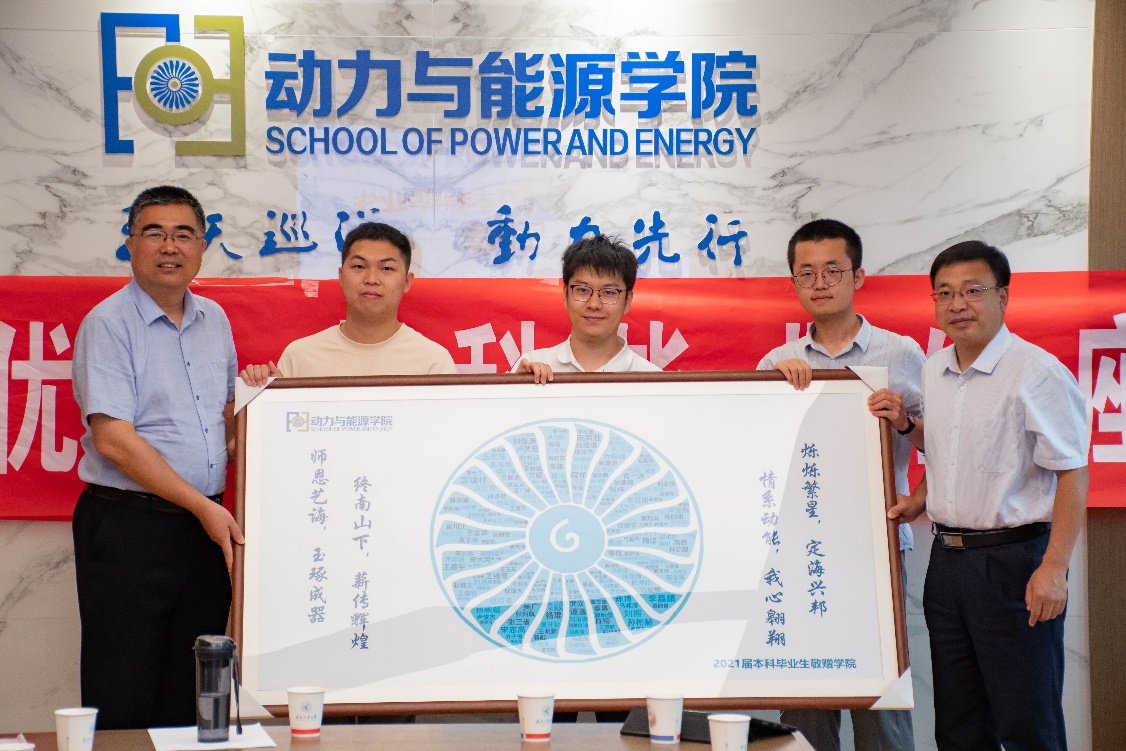 同时,2021届全体毕业生们也为学院送上了一份饱含情谊的礼物——书写“师恩艺诲,玉琢成器,终南山下,薪传辉煌”与每位毕业生姓名构成的航发图画。同学们将青春的回忆和对母校沉甸甸的爱融入这一特殊的礼物中,祝福母校早日建成学科特色鲜明的世界一流大学,为祖国国防事业锻造源源不断的利剑。