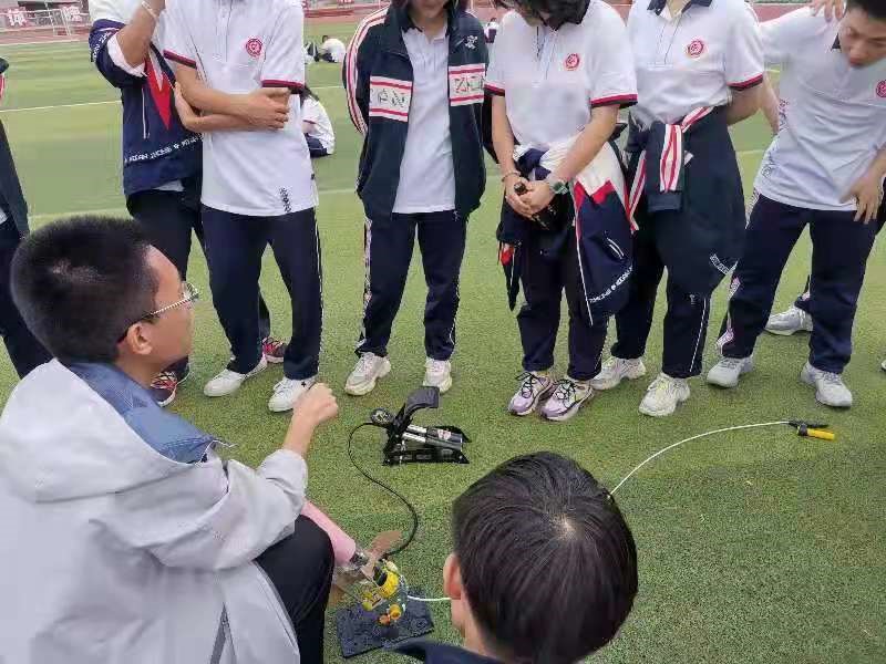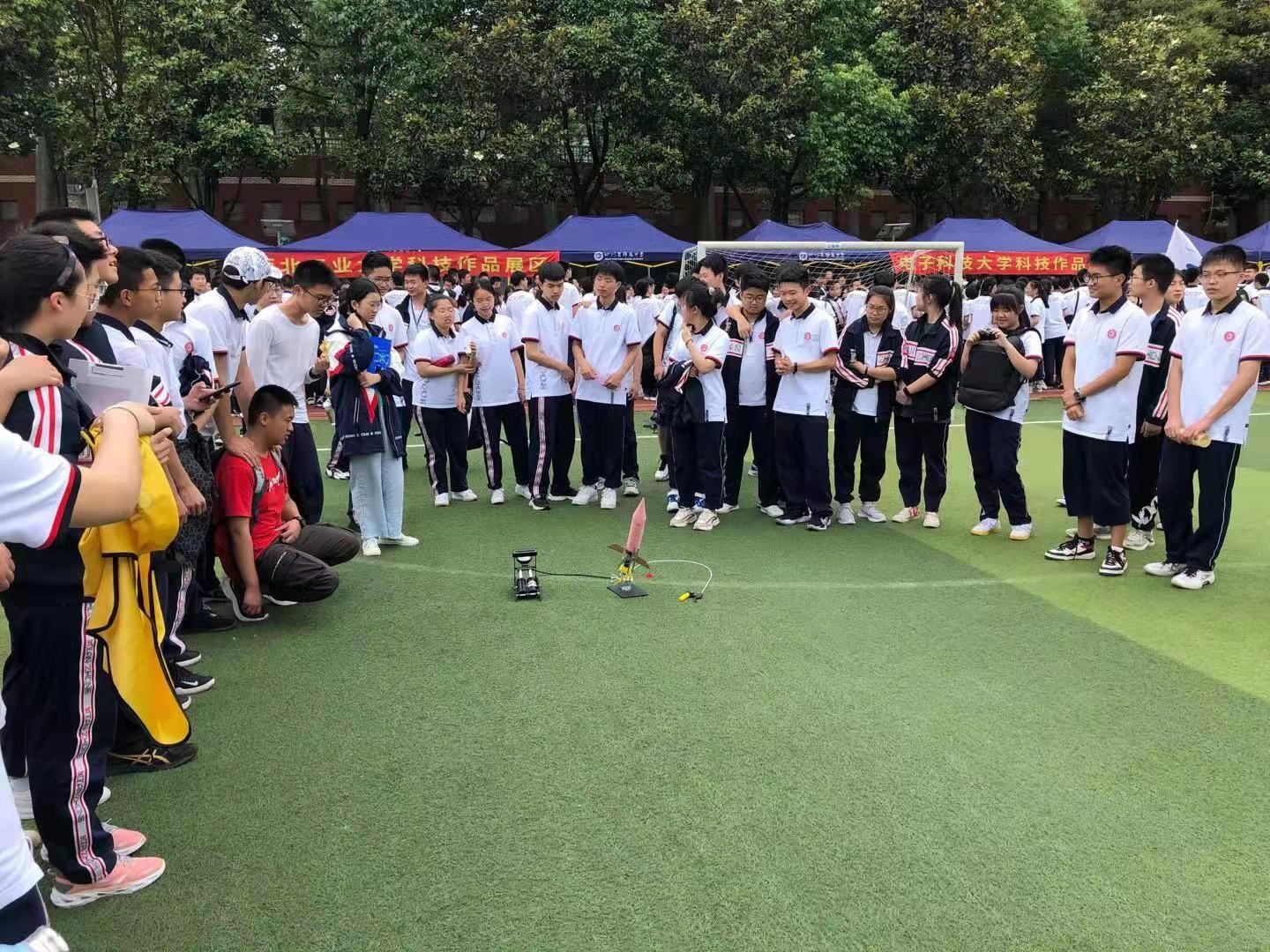 绵阳中学科技节启动仪式一经开始,我校的科技作品展区便人山人海。科普志愿队分别对参展的八件大学生科技作品进行了介绍并发射了水火箭,中学生们在整个观看过程中热情度极高并不停欢呼,掌声不断。