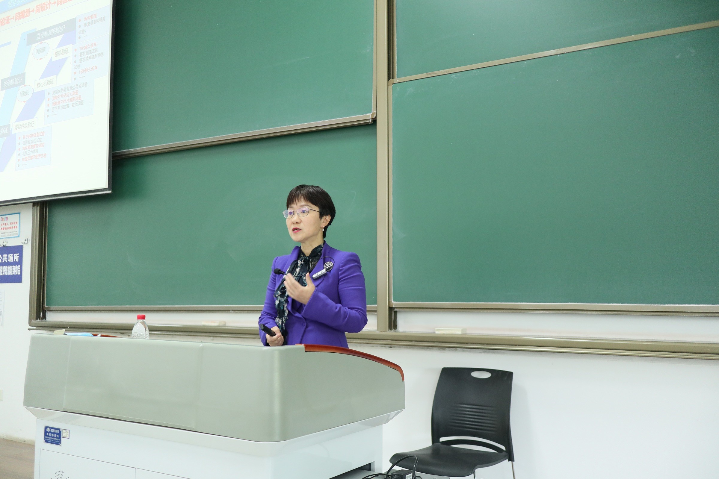 首先,廖明夫教授介绍了参加报告会的嘉宾、学院领导和报告主要背景和内容。随后,王占学院长介绍了黄维娜总师的学术经历、所取得的重要成果、以及所获得的主要荣誉。黄维娜总师在报告开始之前,深情回顾了自己在母校的求学生涯,表达了对母校和老师的浓情厚意。接下来黄维娜总师结合自己长期从事发动机基础研究和型号研制工作的经验和感悟,从发动机结构完整性的历史、现代实践与发展方向展开了系统阐述。从历史中学习,由发动机结构完整性的发展历史,引出了发动机结构完整性的概念、内涵及重要意义;在实践中思考,阐述了结构完整性在发动机研制中的应用实践与思考,指出了结构完整性在发动机全寿命周期过程中的“五同”发展原则;着眼于未来,提出了结构完整性设计的“六化”发展思路和相应的技术发展路线,并进一步指明了结构完整性实现的最佳途径—汇聚四海智慧、产学研用。