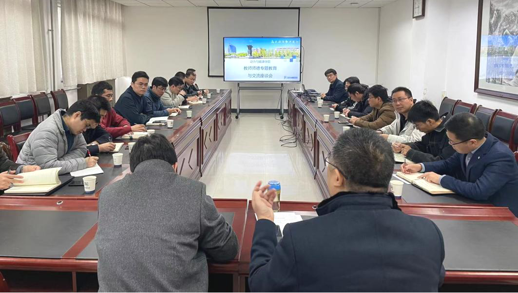 于107会议室举行师德专题教育交流座谈会暨党委书记思政课活动。学院党委书记闫育周、副院长刘存良、副院长王可和宏基班全体青年教师参与此次座谈。