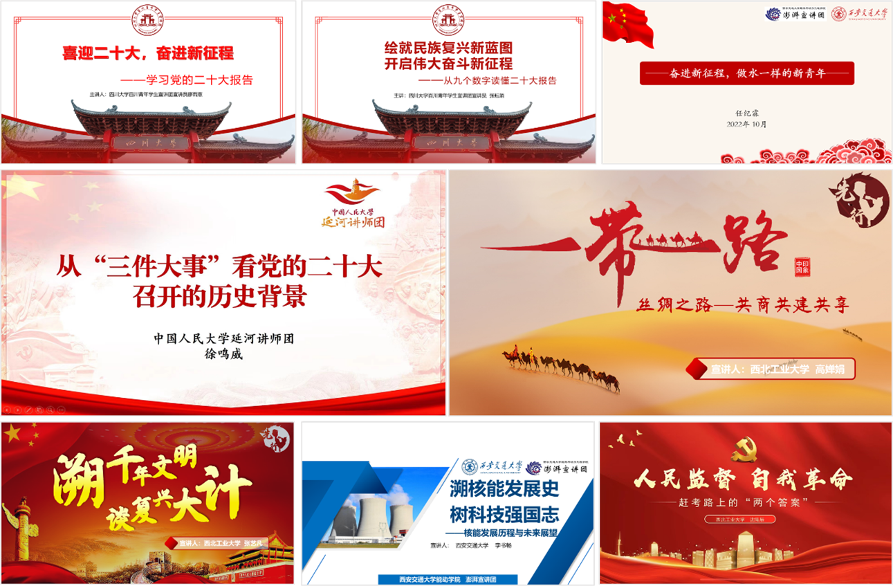 先行学宣团,分别邀请中国人民大学“延河讲师团”、西安交通大学能源与动力工程学院澎湃宣讲团、四川大学百川青年学生宣讲团、无码动漫