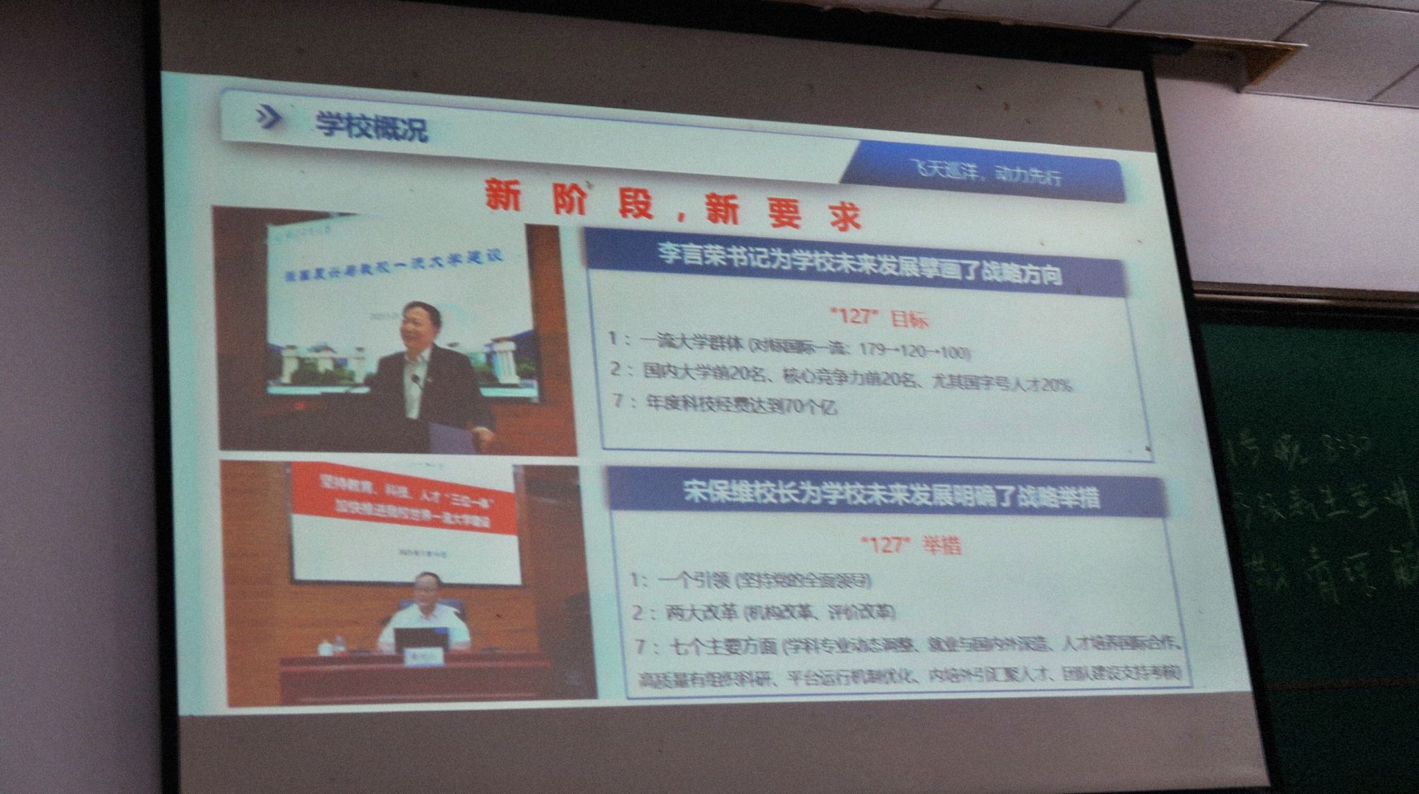 闫书记向同学们介绍了学校概况,重点介绍了在当今科技发展的新阶段,学校有了新的要求和举措。