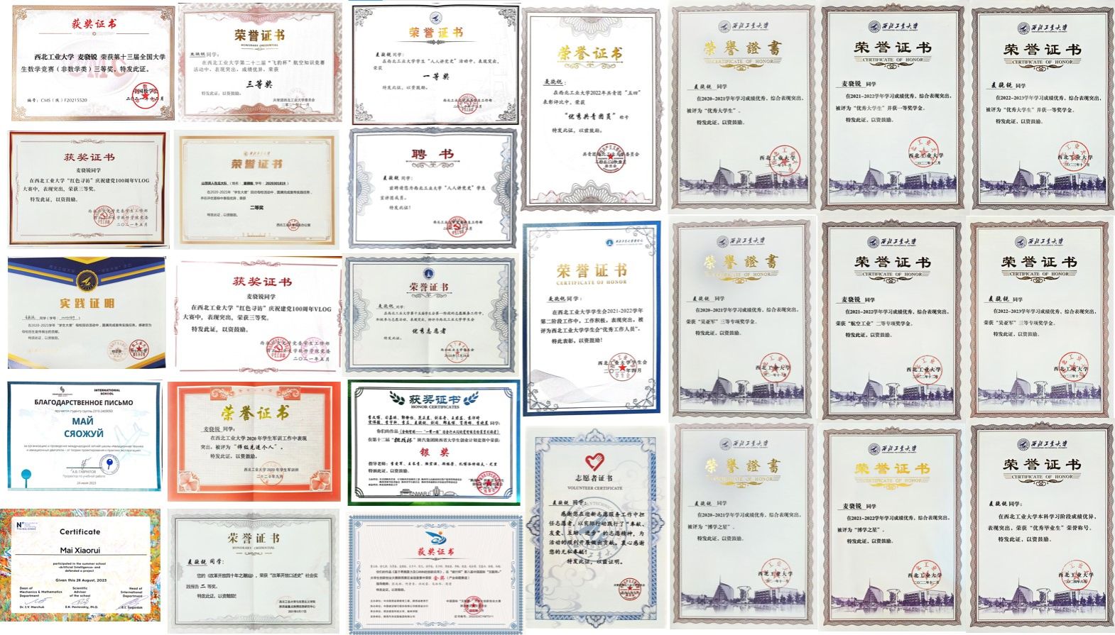 麦骁锐获得的部分奖状和证书