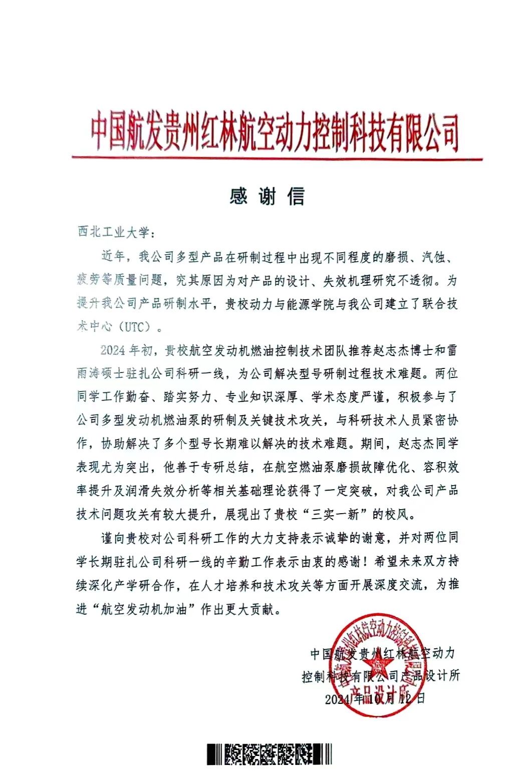 航空发动机燃油控制技术团队于2024年积极推动学院与中国航发贵州红林航空动力控制科技有限公司(以下简称中国航发红林)共建校企联合培养基地,并选派团队综合能力突出、理论和实践经验丰富的博士生赵志杰和硕士生雷雨涛扎根国防军工科研一线,探索研究生在科研生产一线“跟总师、强本领、成大才”的人才培养新路径。
