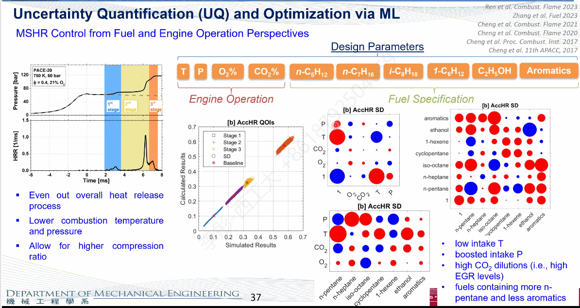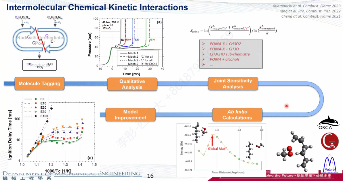 随后,成松教授介绍了他们在燃烧化学方向的研究。在交互化学反应网络方面,现有研究通常忽略了两个大分子机理之间的交互作用,而这种机理对燃烧放热会产生很大的影响,其团队相关研究对该过程进行了修正。此外,成松教授指出随着先进动力和推进系统的发展,对推力和功率密度提出了越来越高的要求,并介绍了团队在极限工况下的燃烧方面的研究进展。