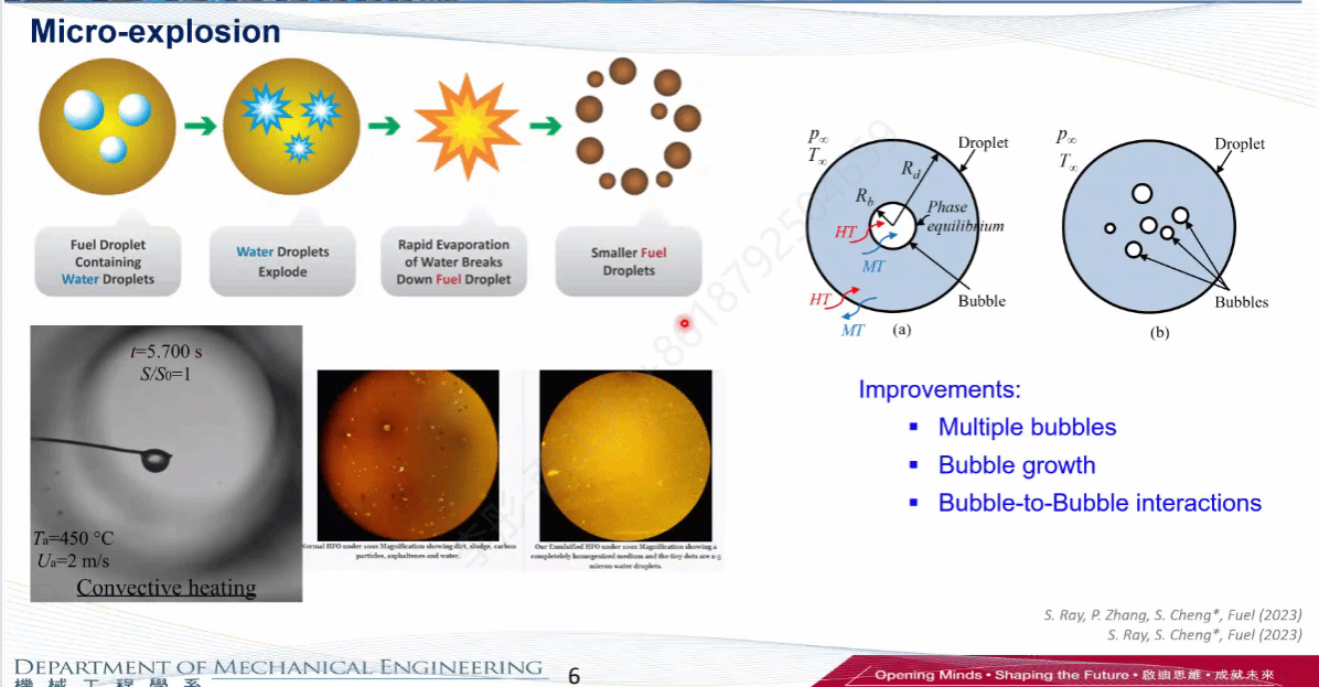 成松教授首先介绍了团队在液滴动力学方向所做的研究工作。以液滴中气泡的微爆为出发点 ,详述了微爆现象的发展过程,概述了多种微爆仿真模型,随后指出,现有的微爆模型不适用大尺度、大规模的燃烧场景。针对这一问题,其团队充分考虑液滴表面的传热和蒸发,开发了一个效率更高、适用范围更广的计算模型。