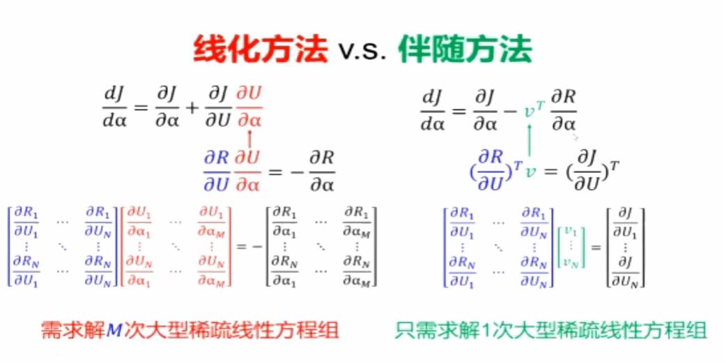 其次,徐慎忍副教授结合应用实际介绍了伴随优化的原理和应用现状。优化方法分为梯度优化和非梯度优化。梯度优化需要计算其梯度,常用的有限差分方法计算成本随着设计变量的增加显著升高,但是目标函数梯度计算量与设计变量的数目无关,所以基于伴随方法计算梯度是高维优化的关键技术之一。
