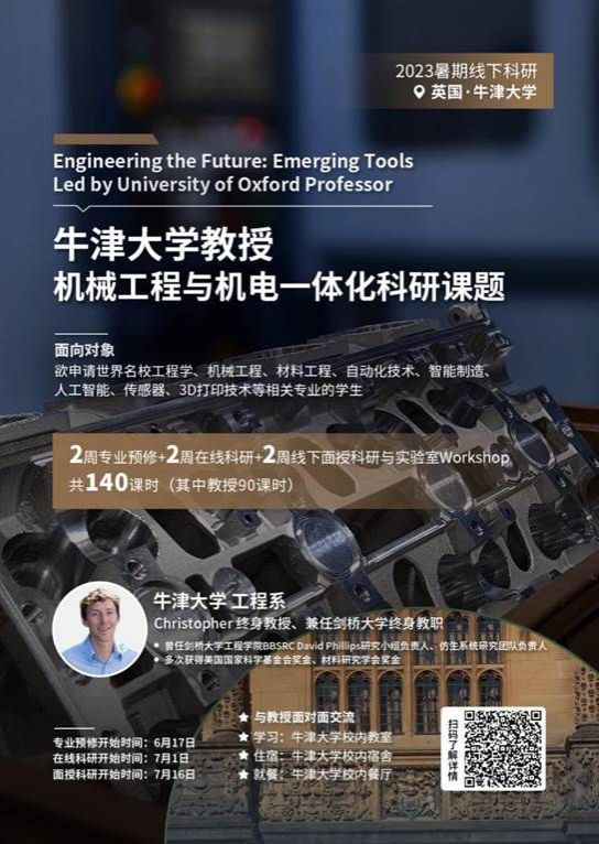 本项目分别由牛津大学终身教授Porf.Proctor和牛津大学研究生院院长终身教授Prof.Terquem领衔,进行一个为期6周(共计140课时)深度科研课题学习。优秀学员将获主导师Reference Letter,以及EI/CPCI/Scopus/ProQuest/Crossref/EBSCO或同等级别索引国际会议全文投递与发表指导。