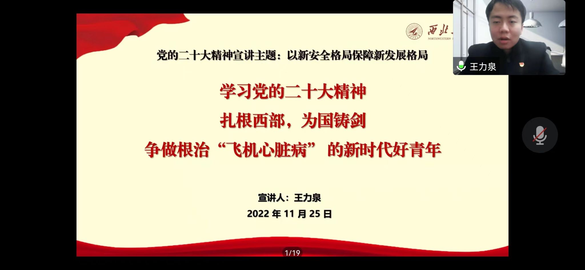 王力泉以“以新安全格局保障新发展格局”为主题,从深刻学习党的二十大中新表述新概括新论断、保持清醒做好学生主责主业、在党建引领下做新时代好青年三个方面深入系统的对党的二十大精神进行宣讲。他在宣讲过程中指出广大学生应该在做好学生主业的基础上自觉向党组织靠拢,做到坚定不移听党话、跟党走。他提到学院将研究生党支部建立在科研团队上,引领人才培养,体现党建赋能作用;他还提到学院为国铸剑,面向国防,立足实践,寻求创新。最后,他提出在学院所学专业是祖国所需要的,倡导大家应该在新发展格局中为国铸剑,做新时代传承发扬西工大“华航西迁”精神的新时代好青年。